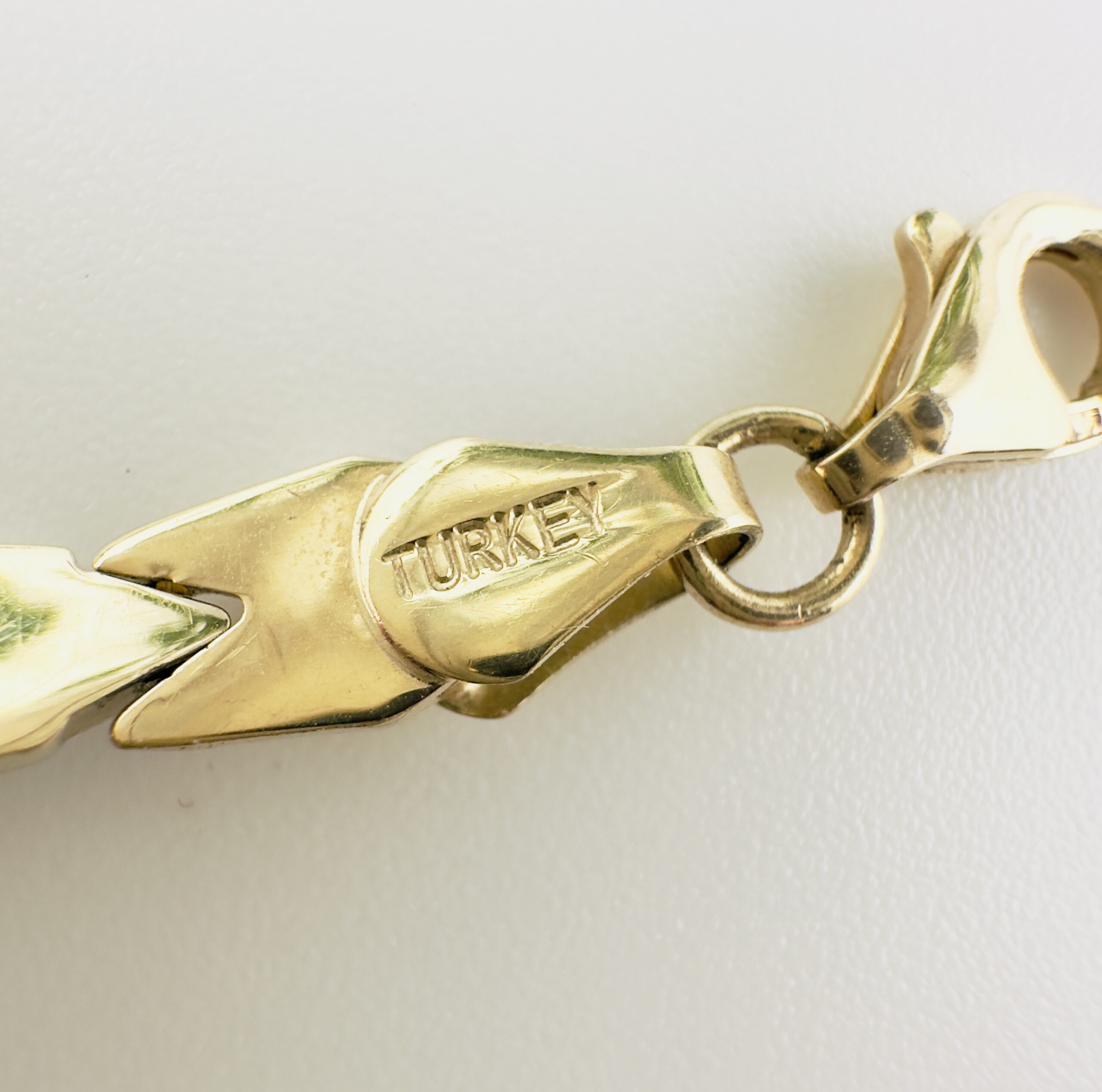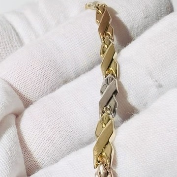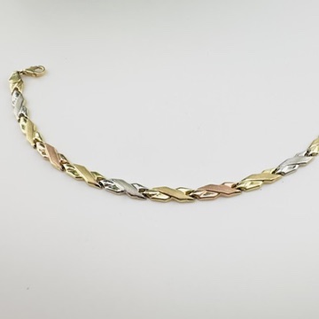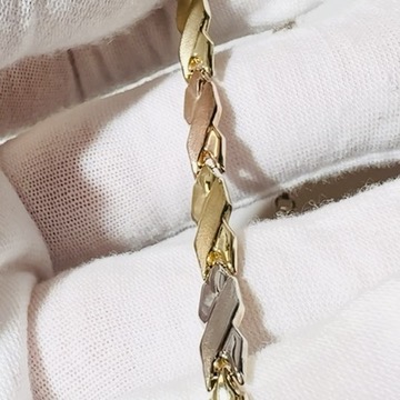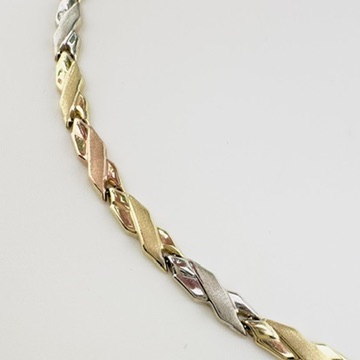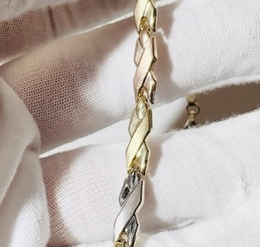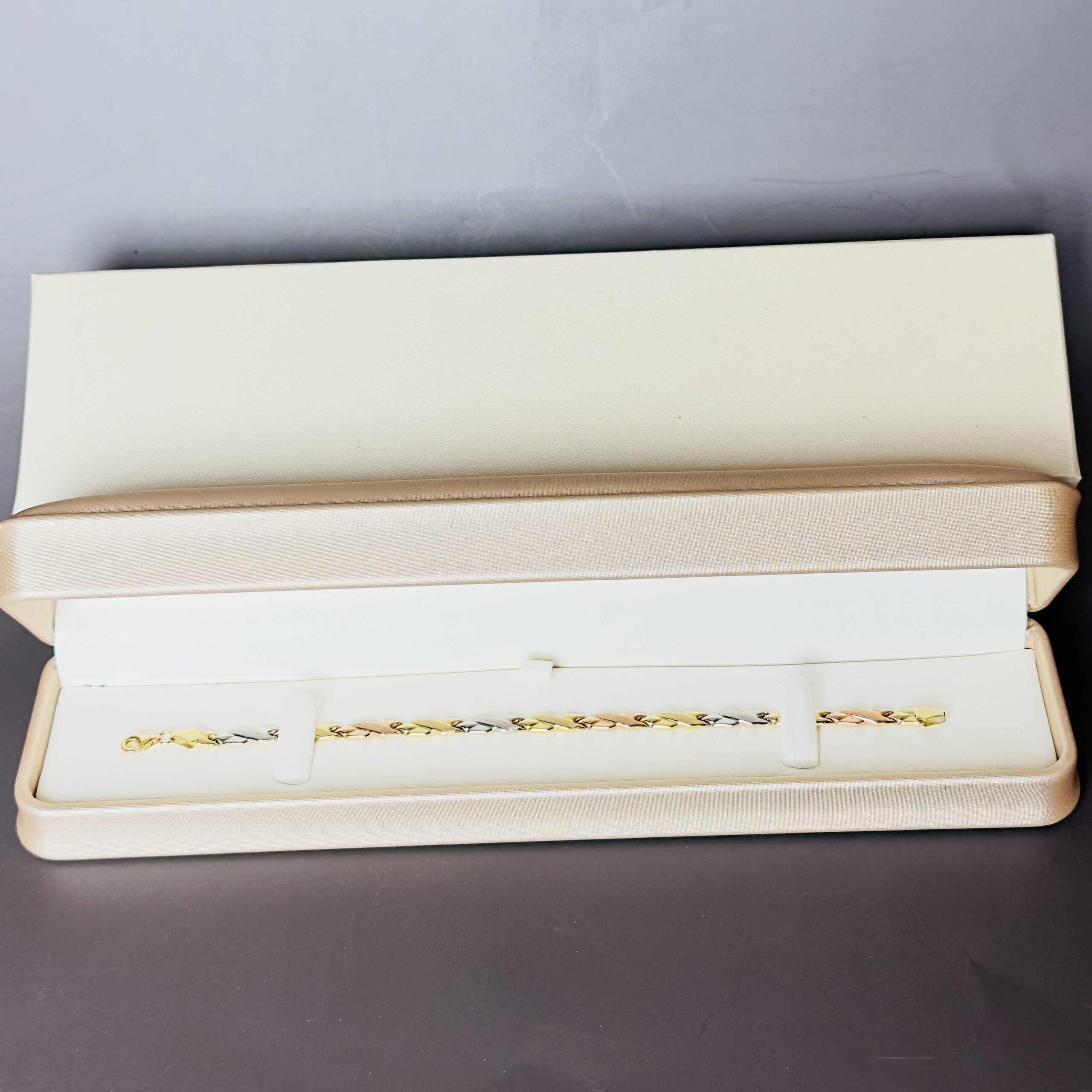10K Yellow, White and Rose Gold Tri tone Bracelet. Ladies Link Cross Ribbon style with Lobster Clasp. 7″ long. 4.75mm wide. 3.4 Grams