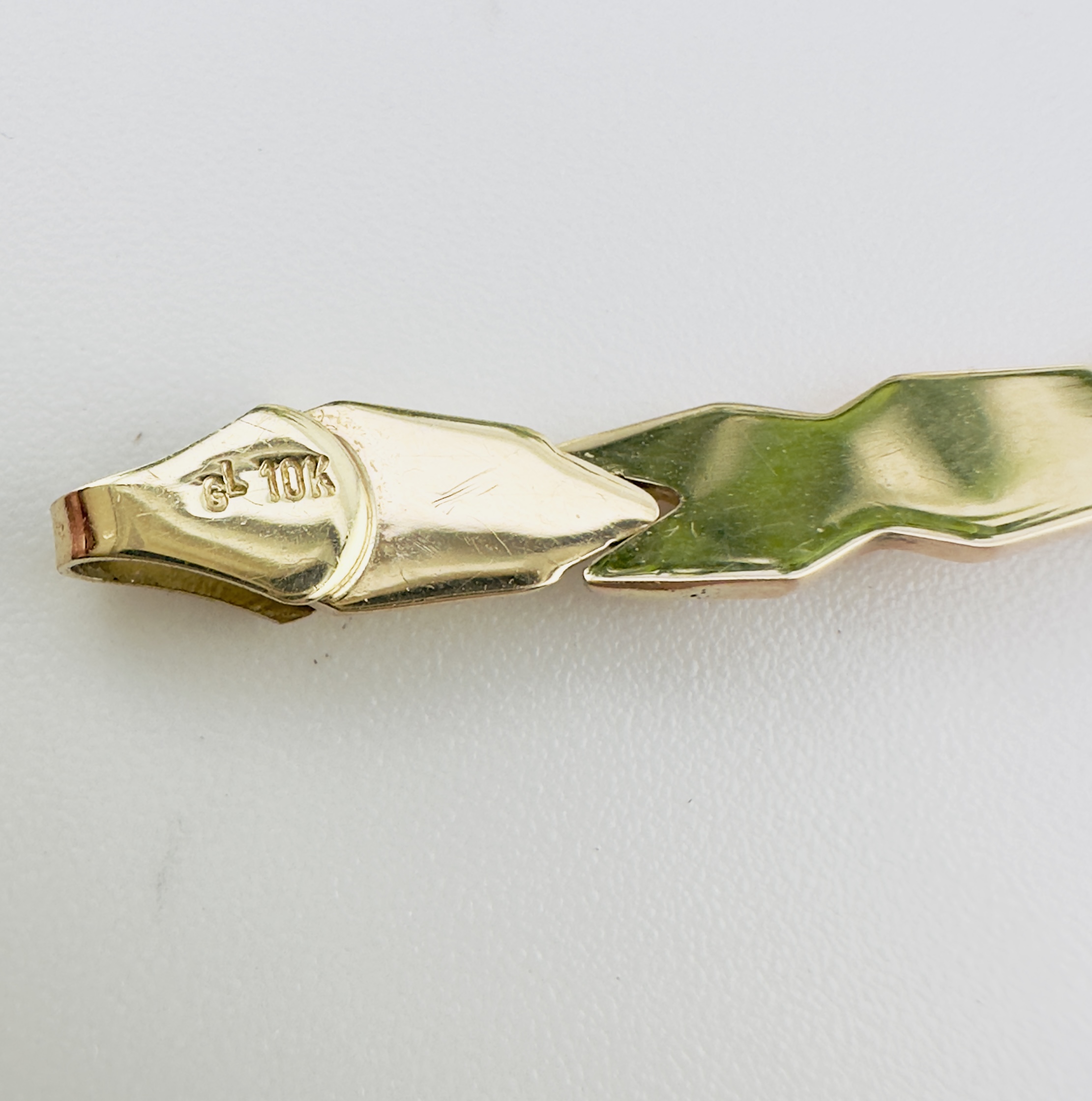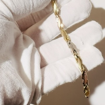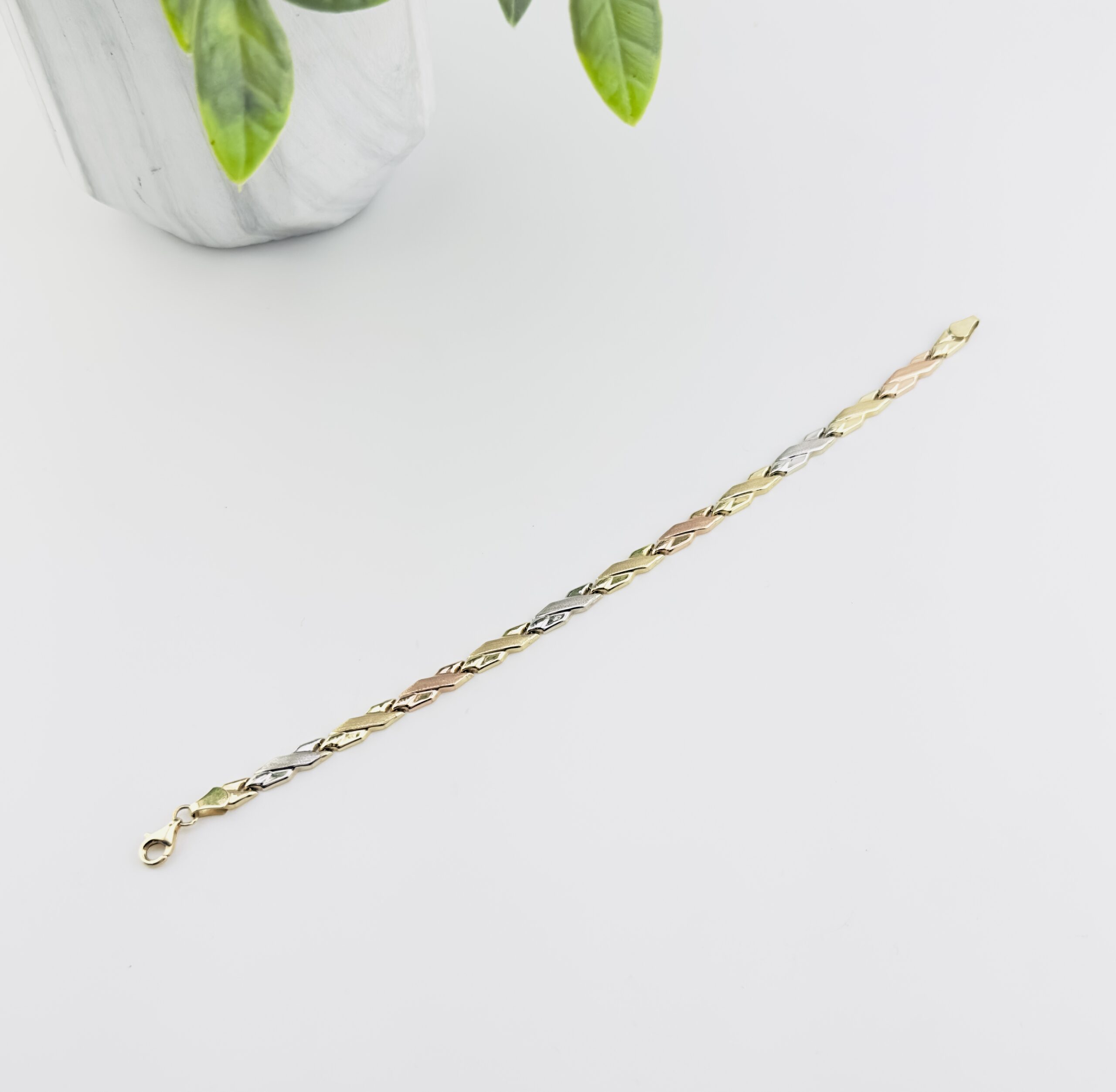 10K Yellow, White and Rose Gold Tri tone Bracelet. Ladies Link Cross Ribbon style with Lobster Clasp. 7" long. 4.75mm wide. 3.4 Grams. Pre Loved in very good condition. Save me from the Melting Pot.