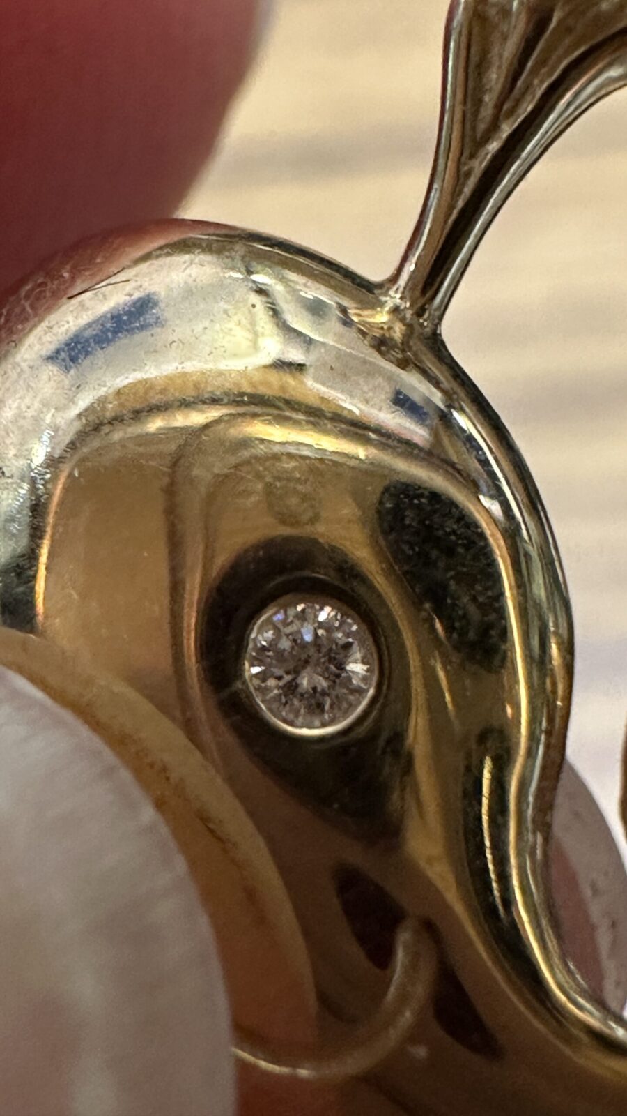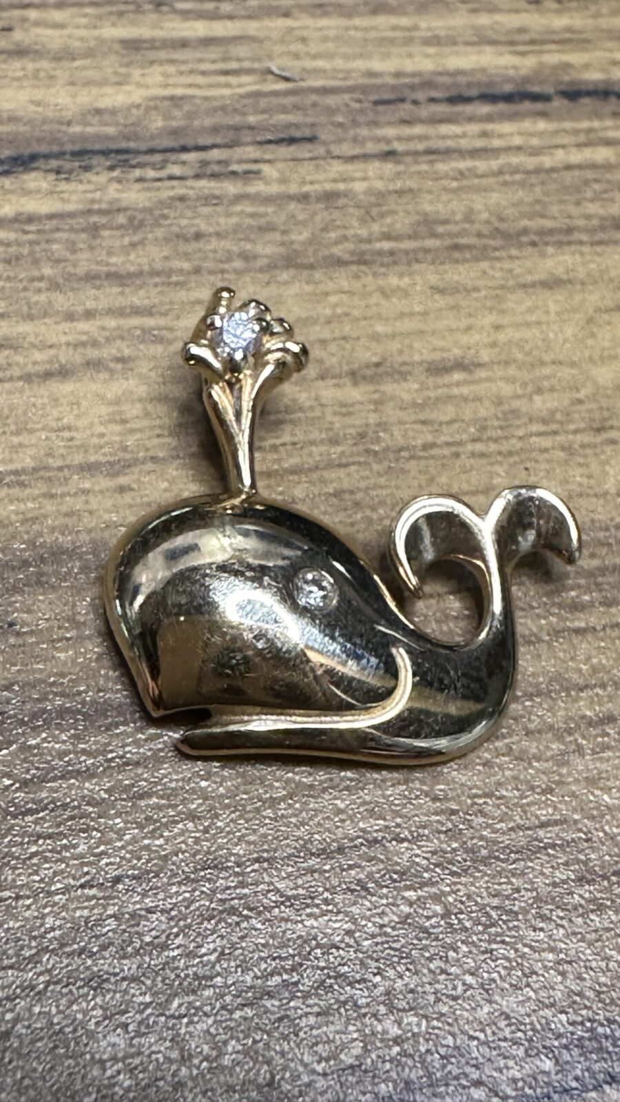 14K Yellow Gold Diamond Whale Pendant. 3/4" x 3/4" with 1 Small diamond flush set in the eye and 1 larger diamond prong set in the waterspout that doubles as the bail. About a half a point of nice white natural diamond in carat weight. Weight 2.3 grams. Pre loved in excellent condition, hardly ever worn. Designer signed with AA hallmark in 1985