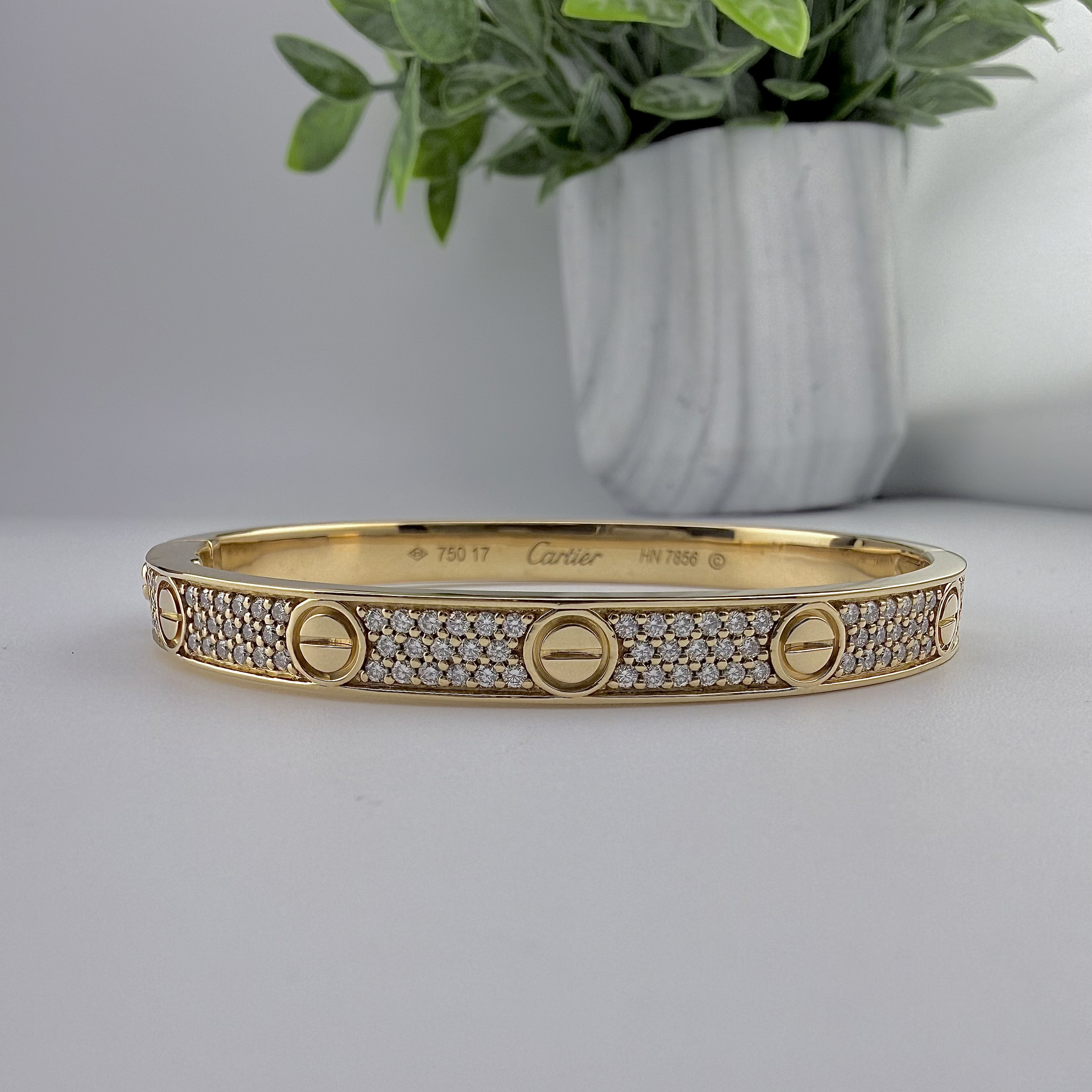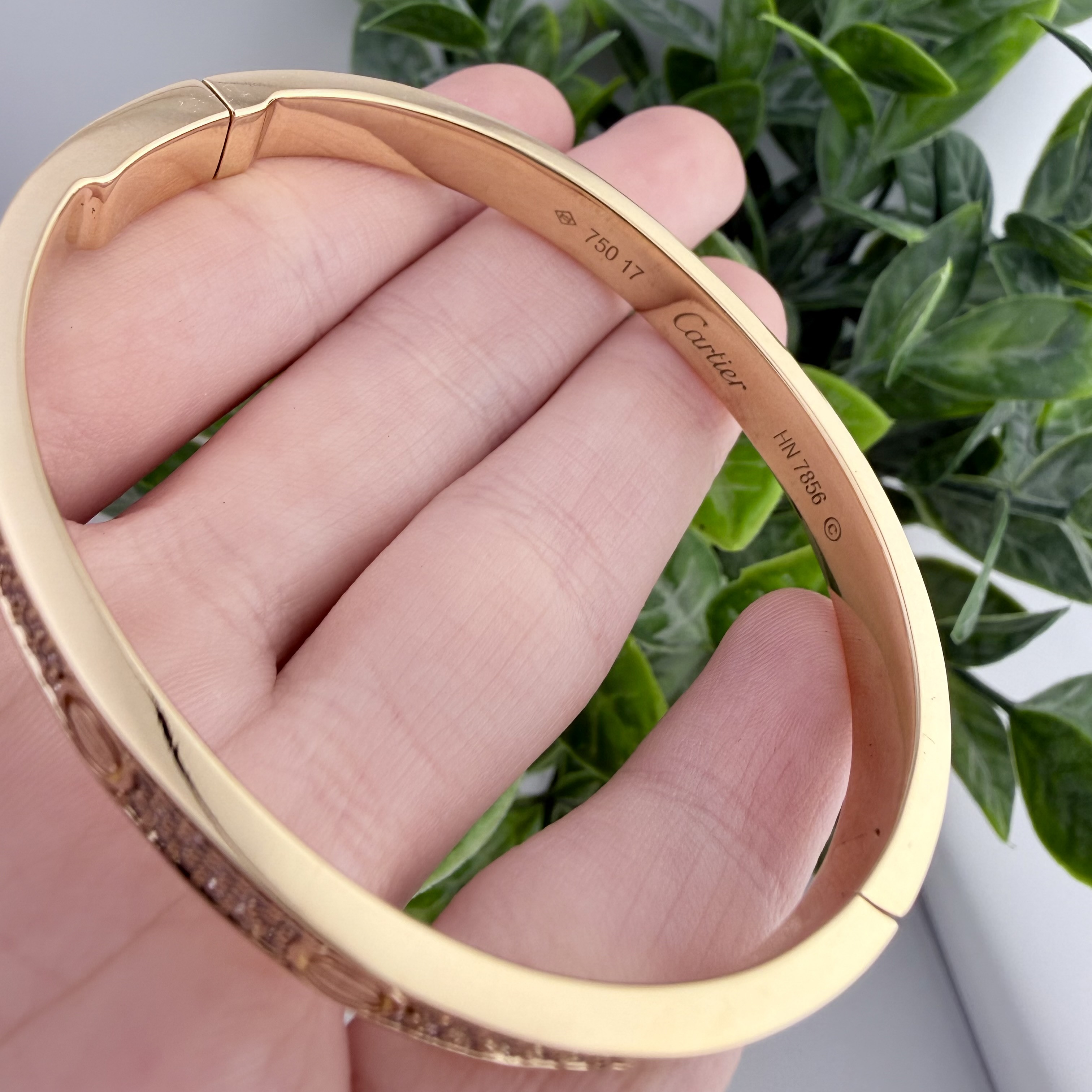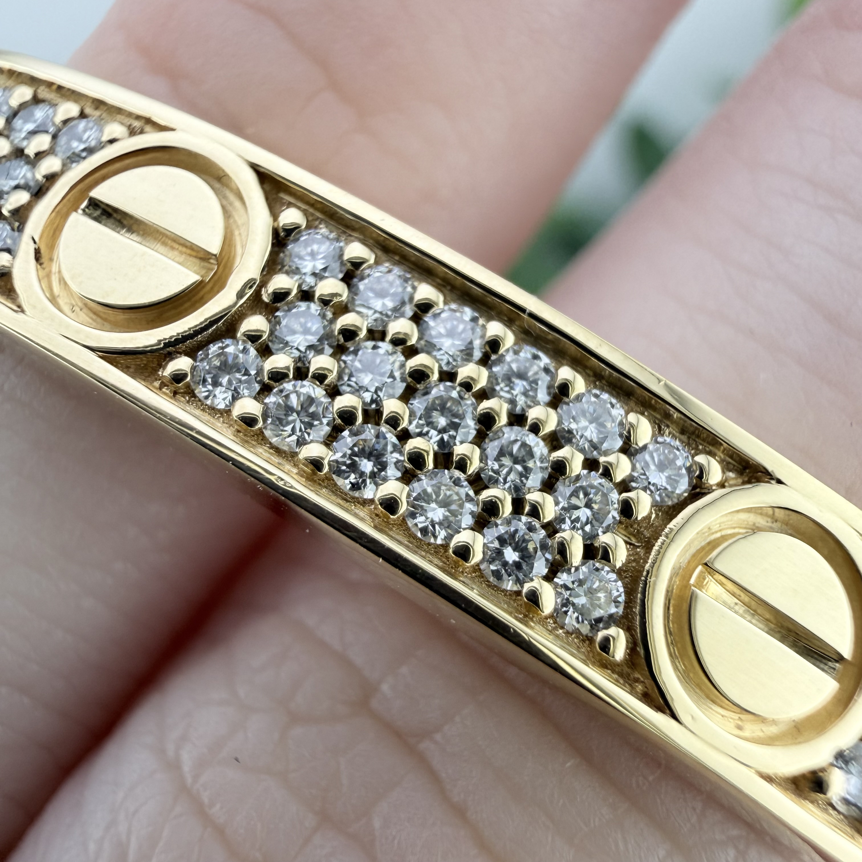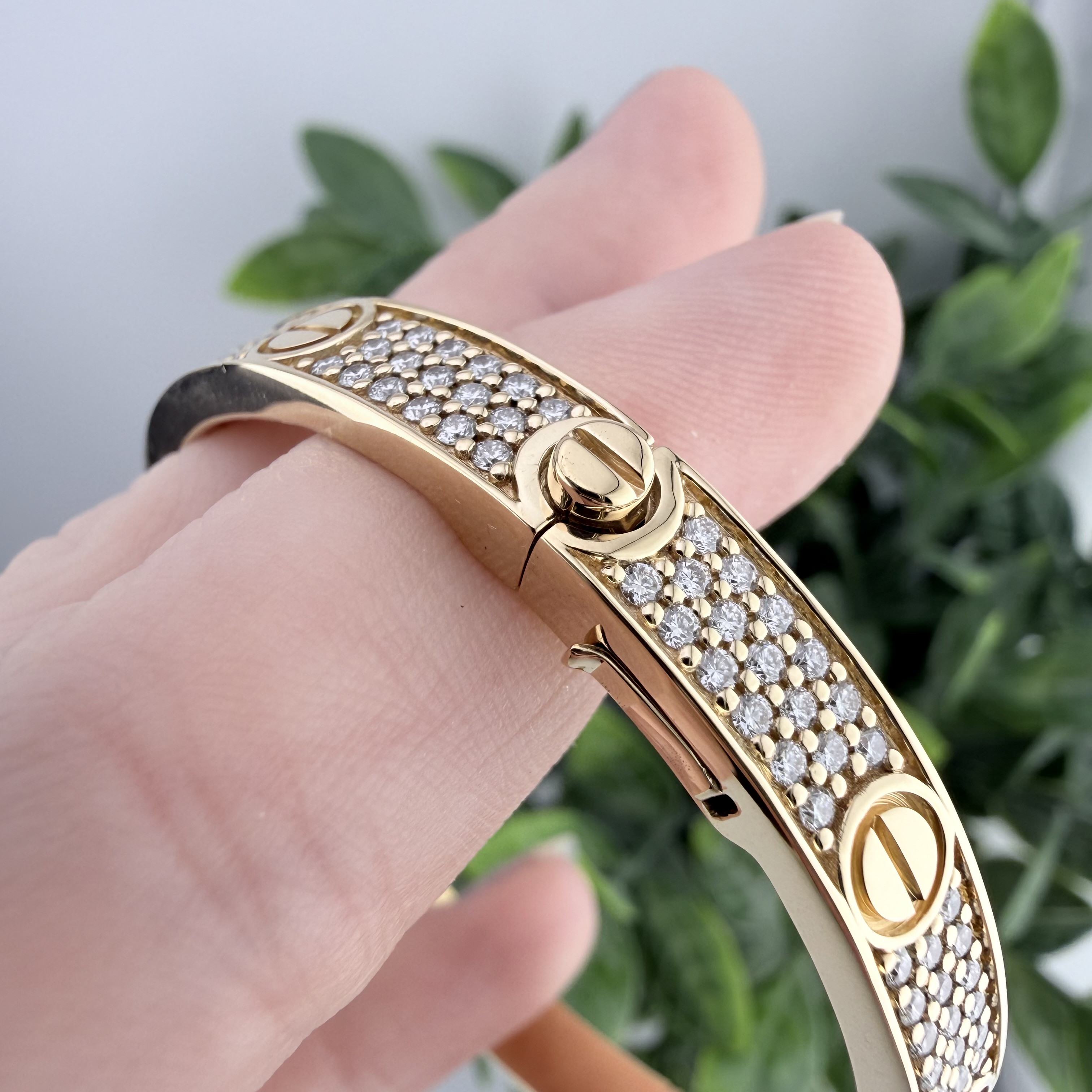 18K Yellow Gold 40 gram Hinged Natural Diamond Pave Bangle Bracelet with 11 faux screws and a 12th that doubles as the clasp button to open the hinge. Fits a 6 and 3/4 inch wrist. Diamonds are VERY high quality, perfectly calibrated VS Clarity and F Color Diamonds. Pre Love in excellent condition. 6.5mm wide. Men's or Ladies, both love these. No Screwderiver is needed for this bracelet, you can take it off and on without help. Pre Loved in excellent condition