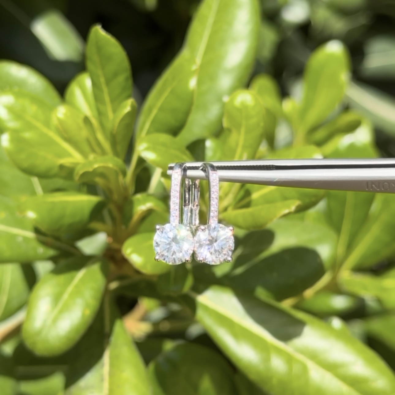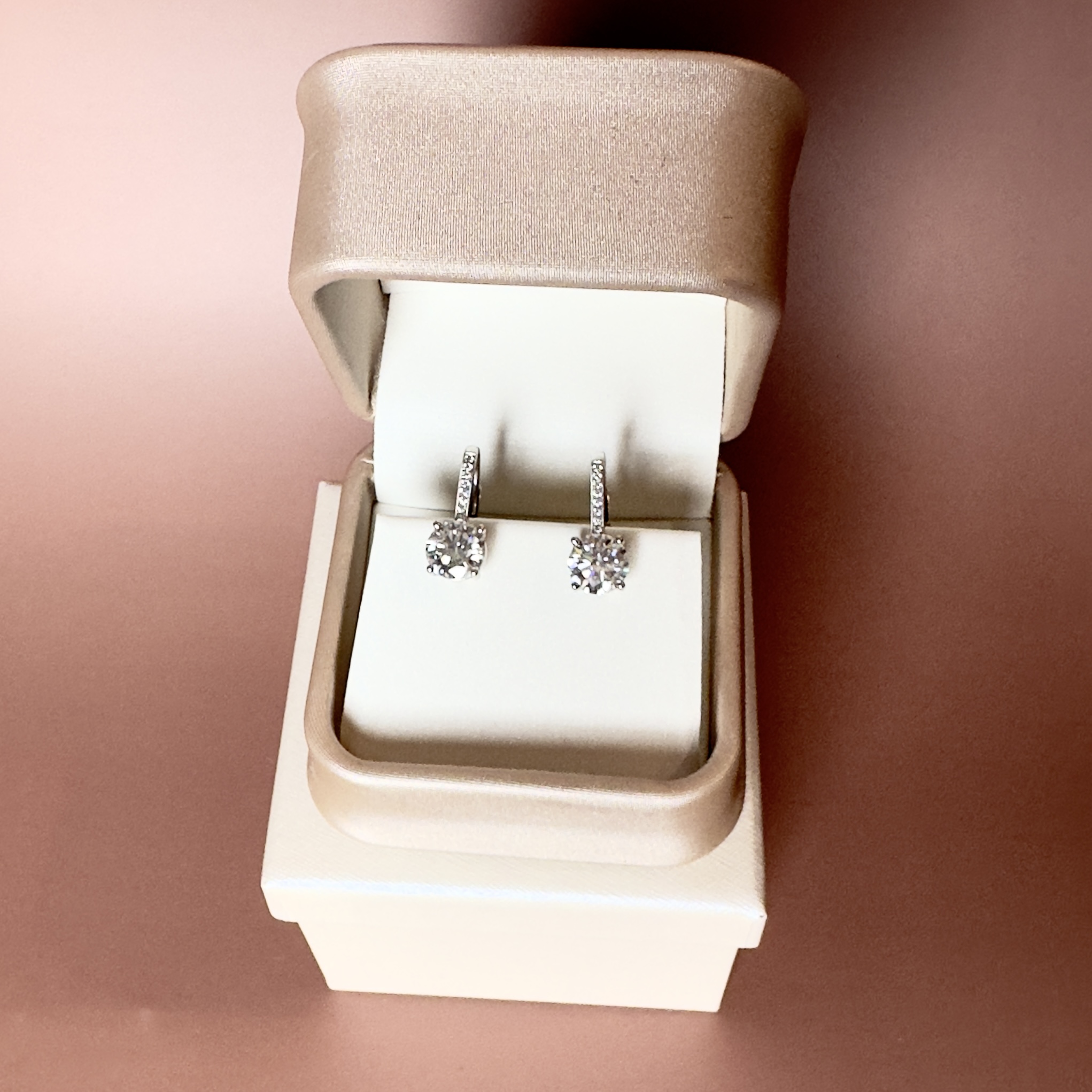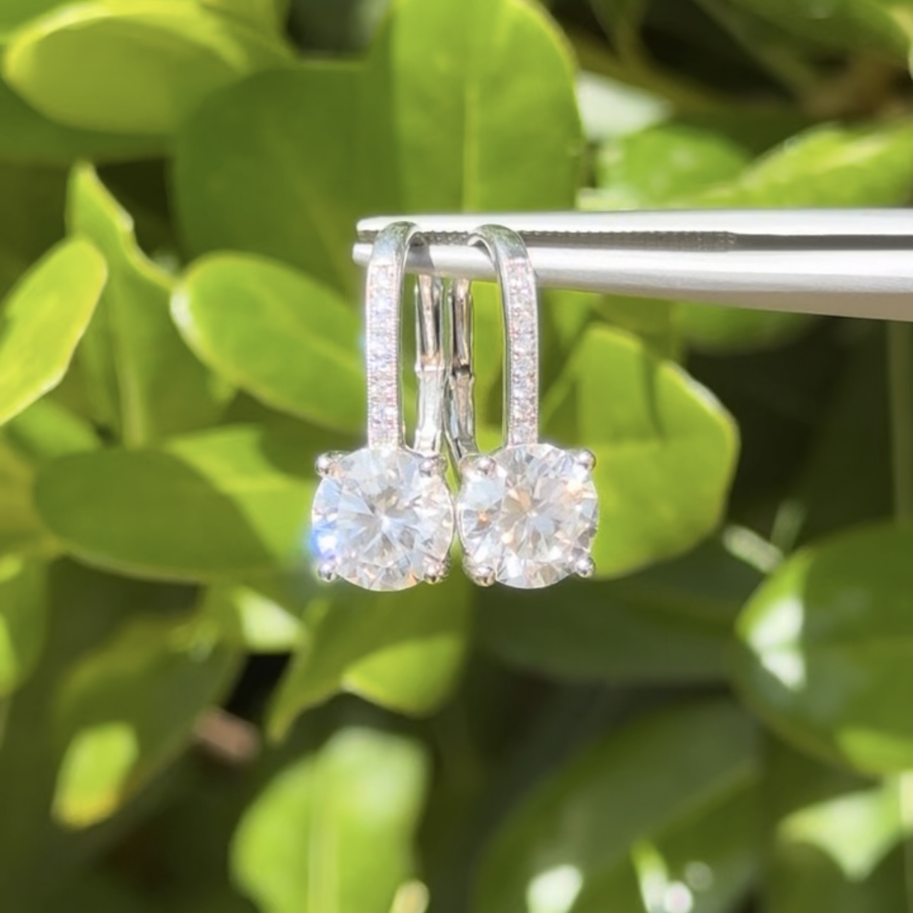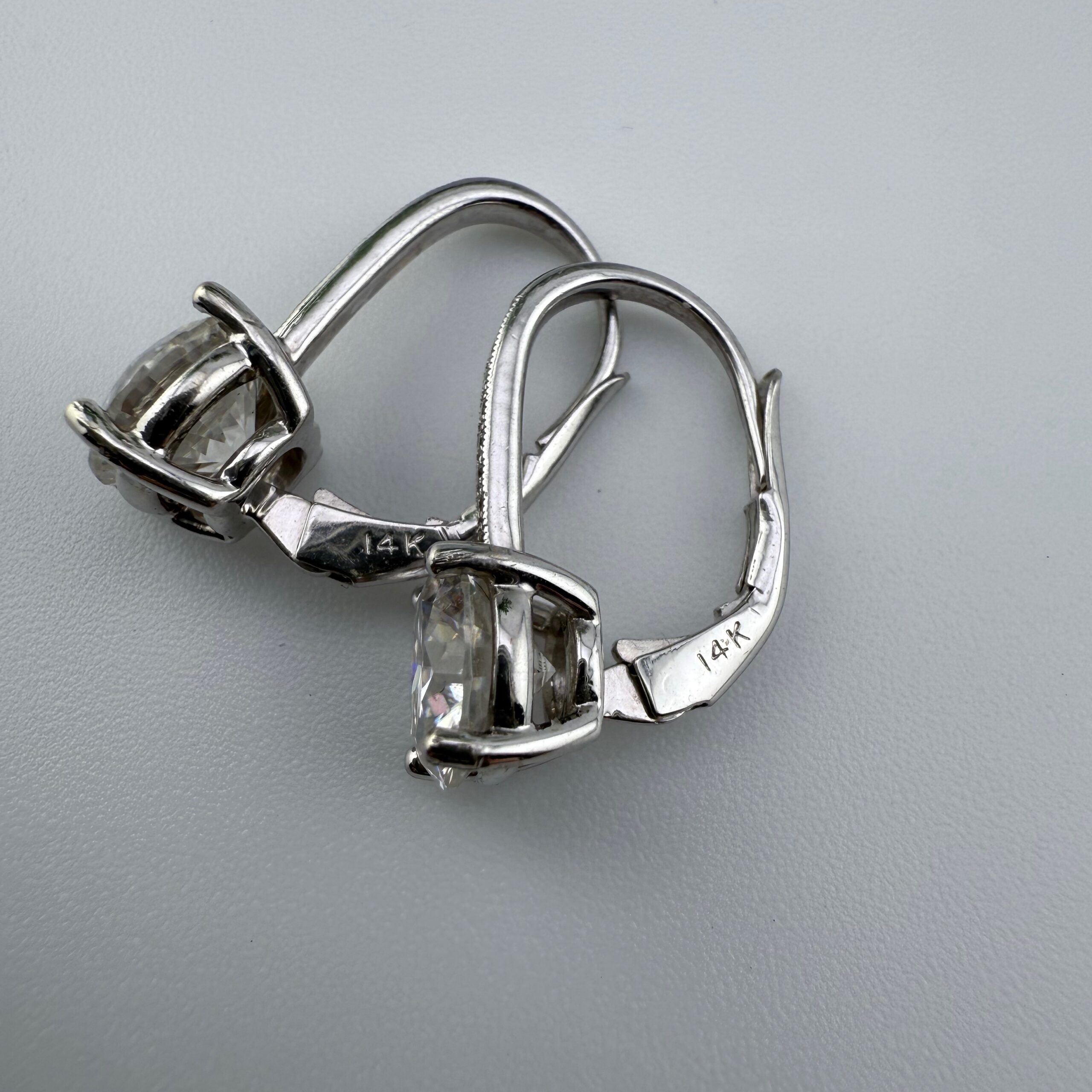 14k White Gold, 7.5mm/ea diameter. IGI Certified VS Clarity, F Color, 3.5 ct. Total Weight Lab Grown Diamonds. Natural VS Clarity, and F Color Diamond Pave on the drops. 3.5 grams. These have my favorite of all time... lever back earring backs. Why? you ask? Because they don't get snagged in your hair if you're wearing your hair down, they don't snag on your clothing when changing clothes, they don't hurt if you fall asleep in them because they're ergonomic and don't have anything pokey on the back. They don't open up easily so they're hard to loose. I just love them, they're almost like a hybrid huggie diamond stud earring.