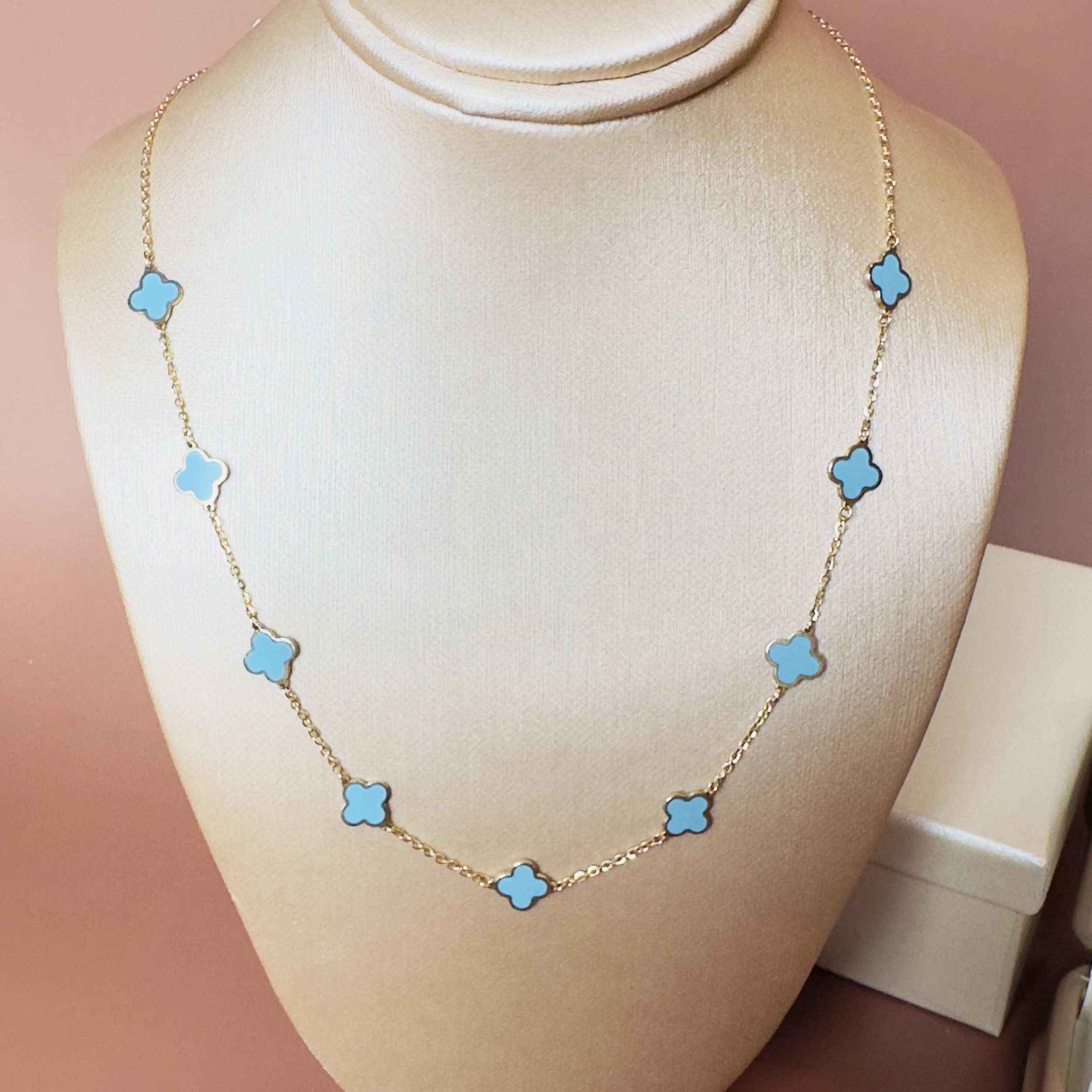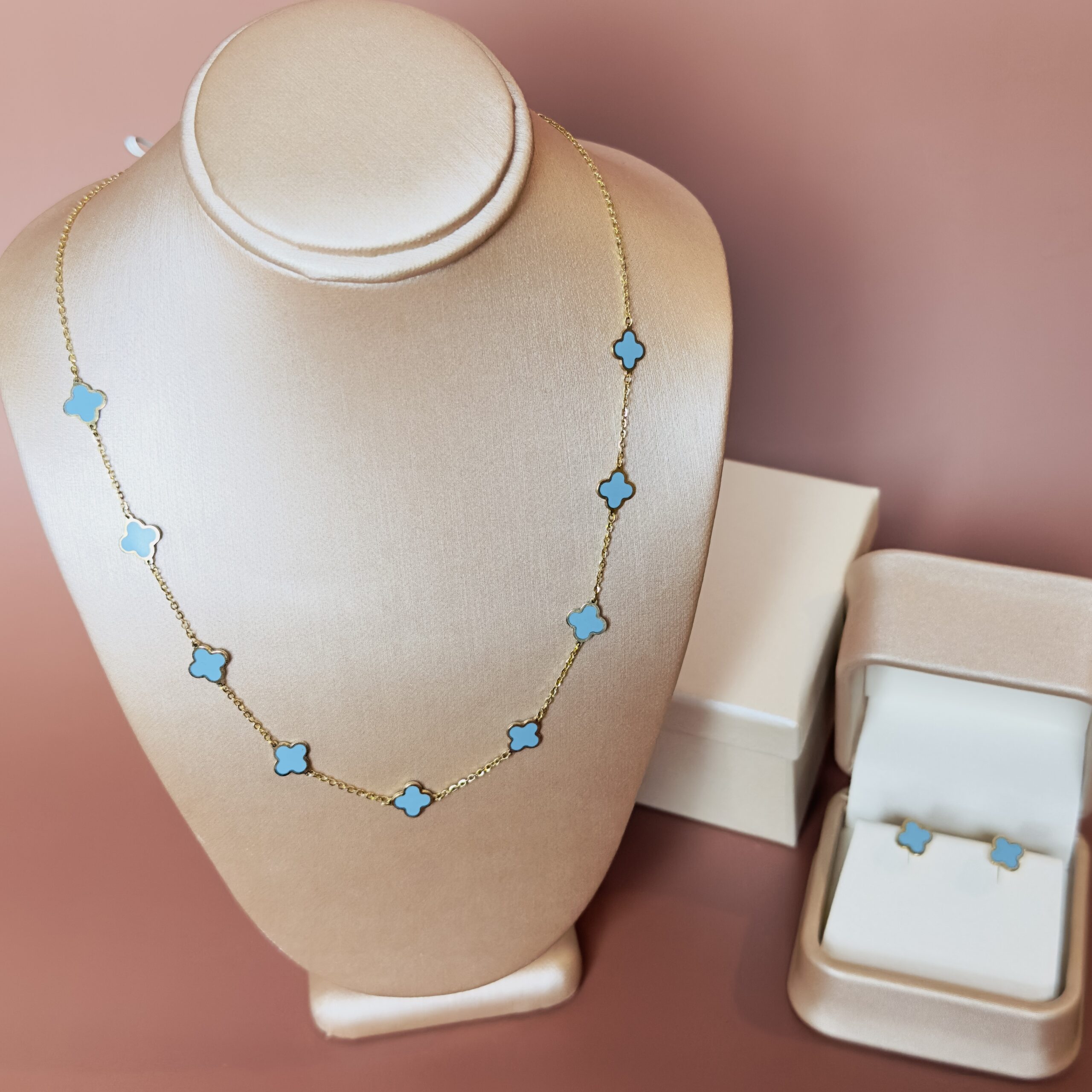 Turquoise 4 Leaf Clover 18″ adjustable to 17″ 14K Yellow Gold 7 station Motif Necklace. 2.7 grams Total Weight. 7.5mm Turquoise 4 Leaf Clover bezel set Stud earrings set in 14K Yellow Gold with friction back backings.