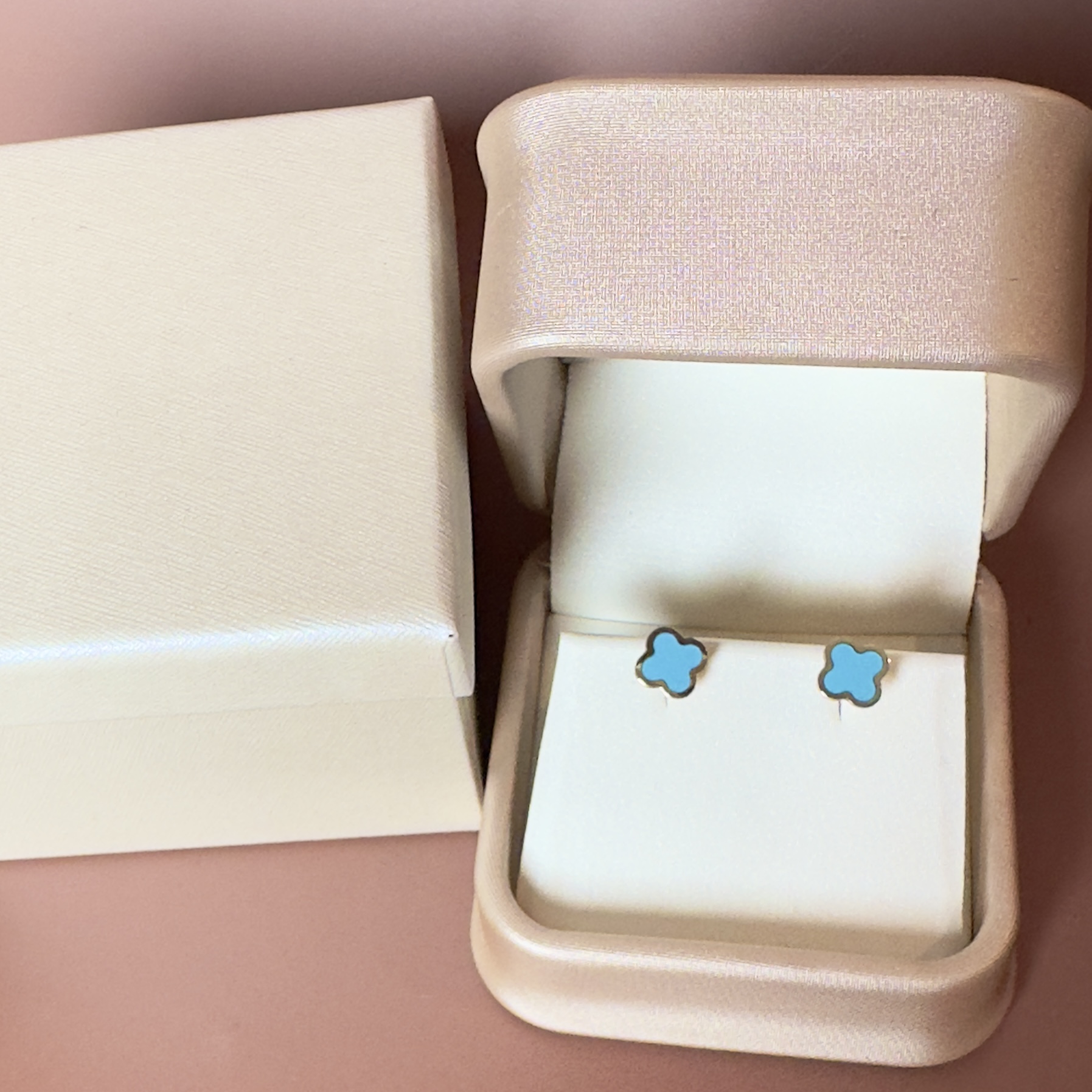 Natural Turquoise 4 Leaf Clover bezel set, with 18" adjustable to 17" cable chain. 14K Yellow Gold 7 station Motif Necklace. There is a matching pair of stud earrings available also. This piece is very well made in Italy. Matching set with the Stud Earrings. Natural Turquoise 4 Leaf Clover bezel set Stud earrings set in 14K Yellow Gold with friction back backings. There is a matching necklace also available. This piece is very well made in Italy. 7.5 mm diameter clovers. 1 gram.